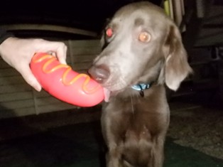 大きなソーセージのオモチャを上手にキャッチしてくれました!